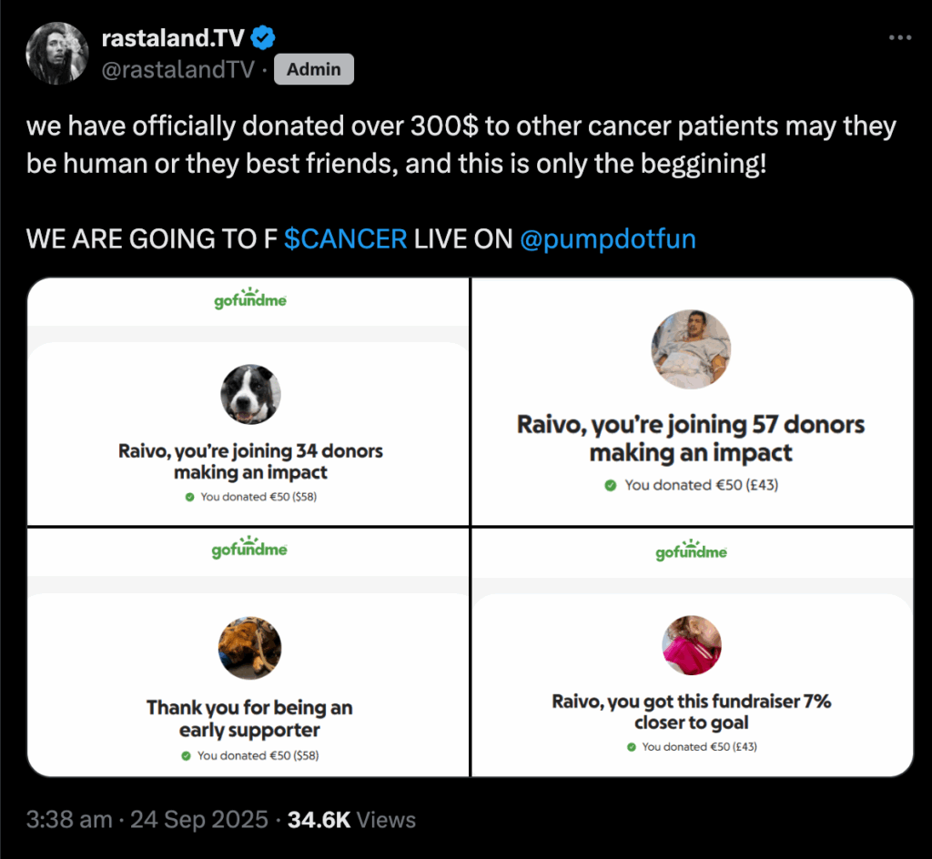 The scammer stole $32,000 from rastalandTV’s treatment fund ($CANCER memecoin).