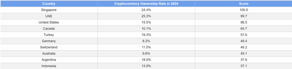 Singapore achieved a perfect composite score of 100, driven by a sharp increase in cryptocurrency ownership and public interest. Search activity underscores this growth: the city-state logged around 2,000 crypto-related queries per 100,000 residents, the highest rate globally.