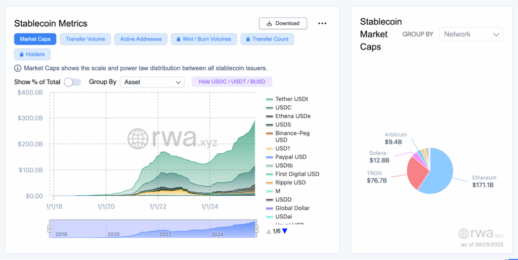 Ethereum remains the dominant settlement layer, hosting $171 billion worth of stable assets, while Tron trails with $76 billion. Together, they account for the lion’s share of circulation, dwarfing newer ecosystems like Solana, Arbitrum, and BNB Chain.